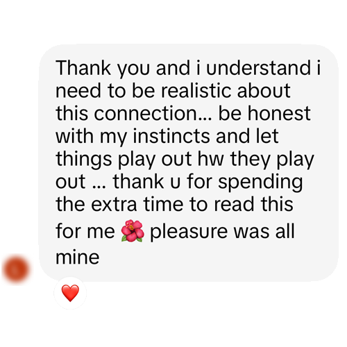 A 5-minute voice note interpreting your situation. Privately delivered to your DMs within 24 hours.