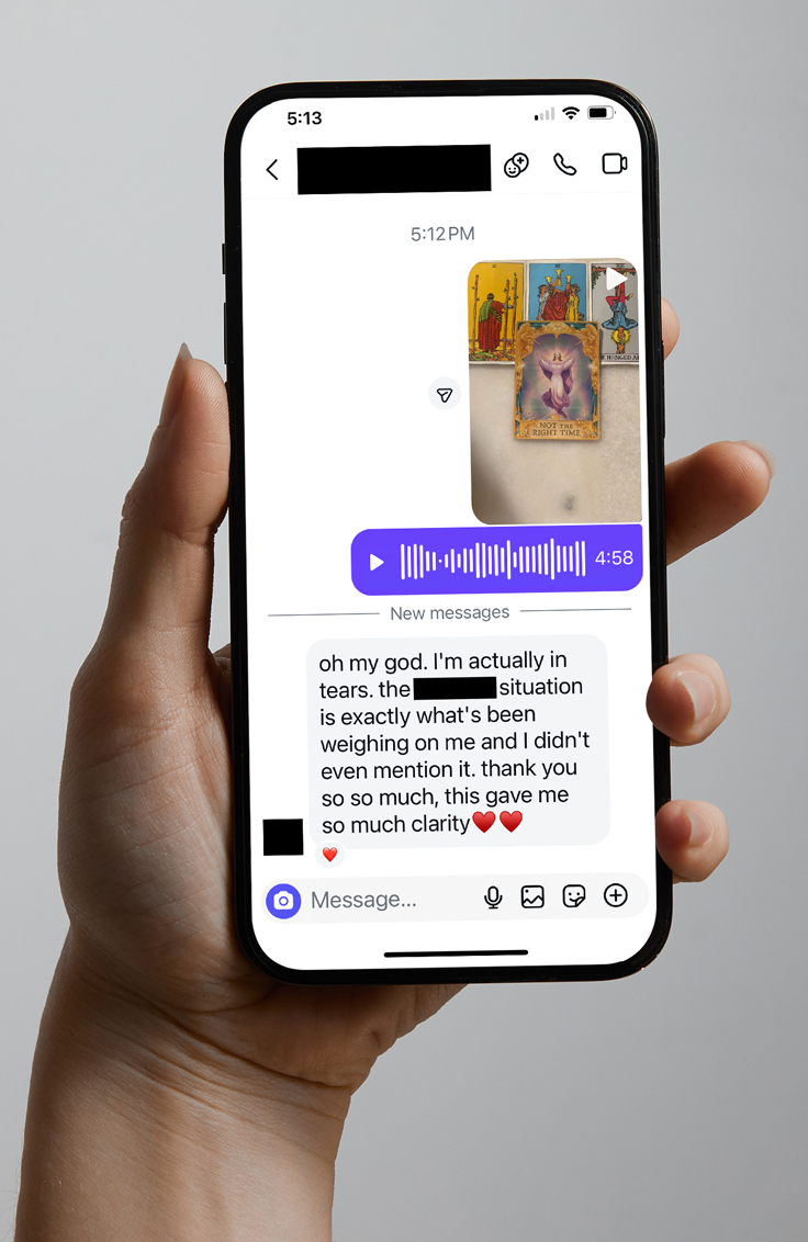 A personal reading delivered straight to your DMs. You share your situation or question, cards are drawn with intention, and you receive a photo of your spread with a voice interpretation walking you through what the cards reveal. No waiting, no scheduling — same-day delivery on Instagram or TikTok.